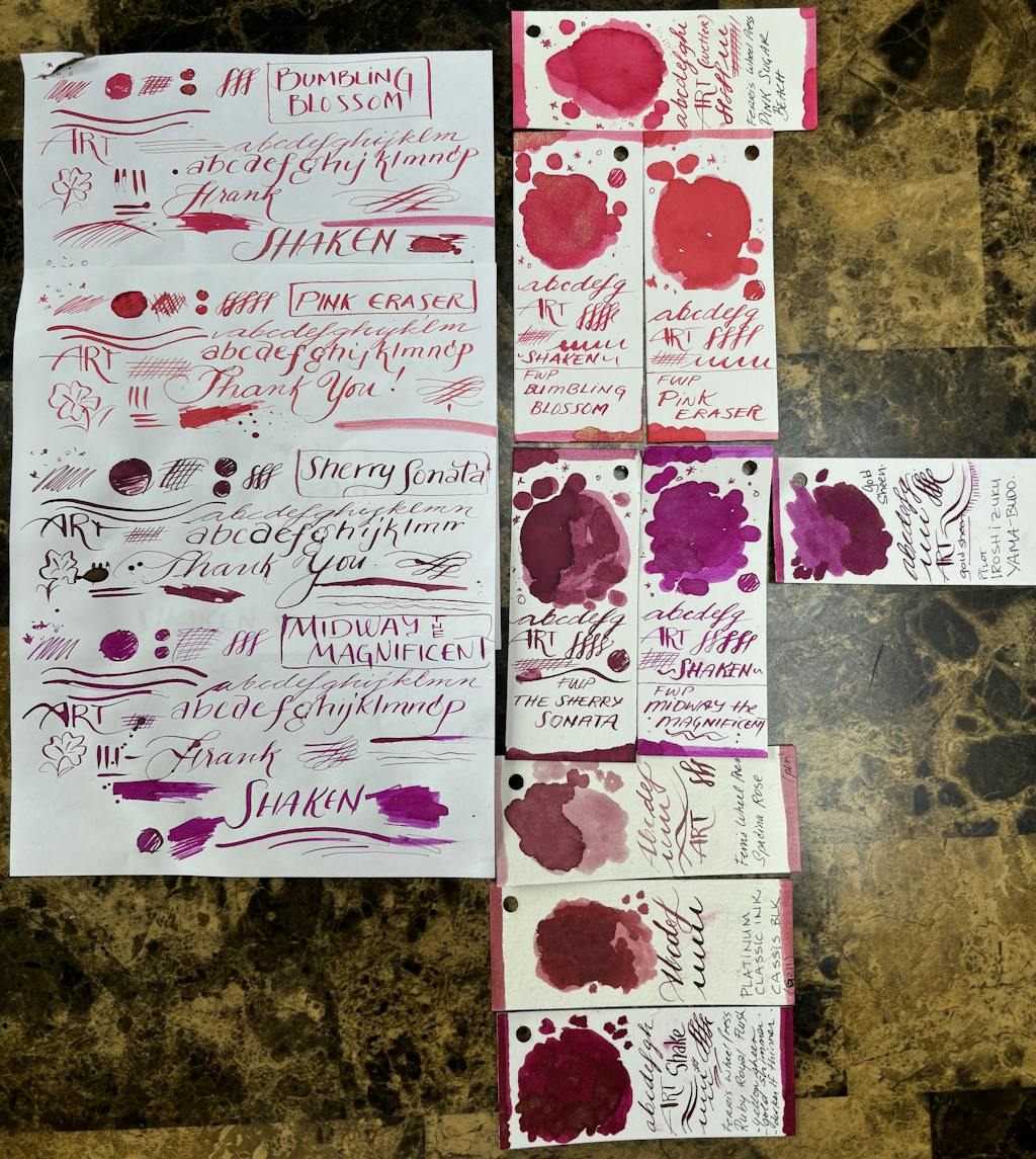 The ink in the bottles have been adjusted, to the best of our ability, to illustrate their appearance on paper. The ink swatches are the best representation of the colour.